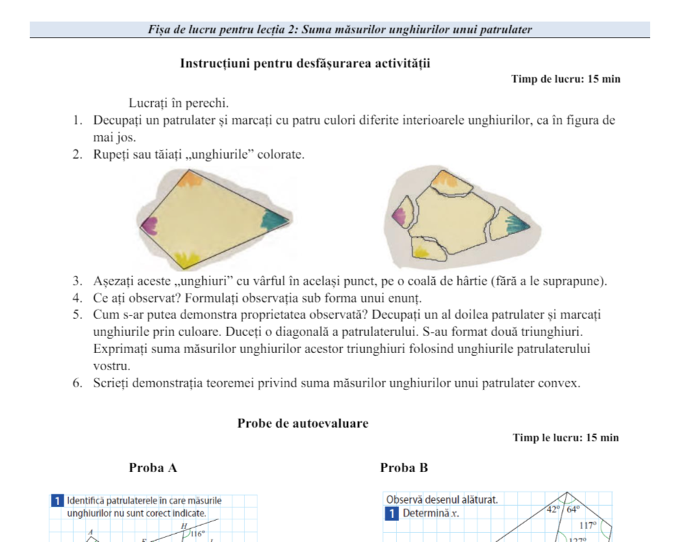 În cadrul acestui material, este evidențiat scenariul lecției, extras din proiectul unității de învățare, după care urmează o fișă de lucru pentru elevi și două probe de evaluare. La finalul materialului, sunt prezentate recomandări pentru profesor privind organizarea activităților pe parcursul desfășurării lecției.