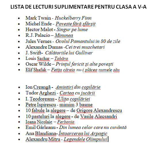 Lista de lecturi suplimentare pentru vacanta - clasa a V-a