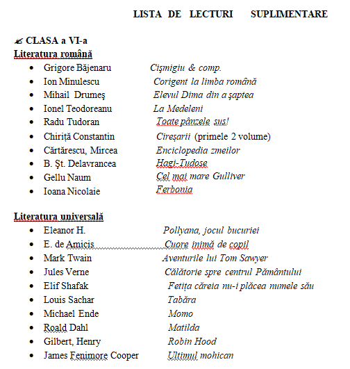 Lista de lecturi suplimentare pentru vacanta - clasa a VI-a