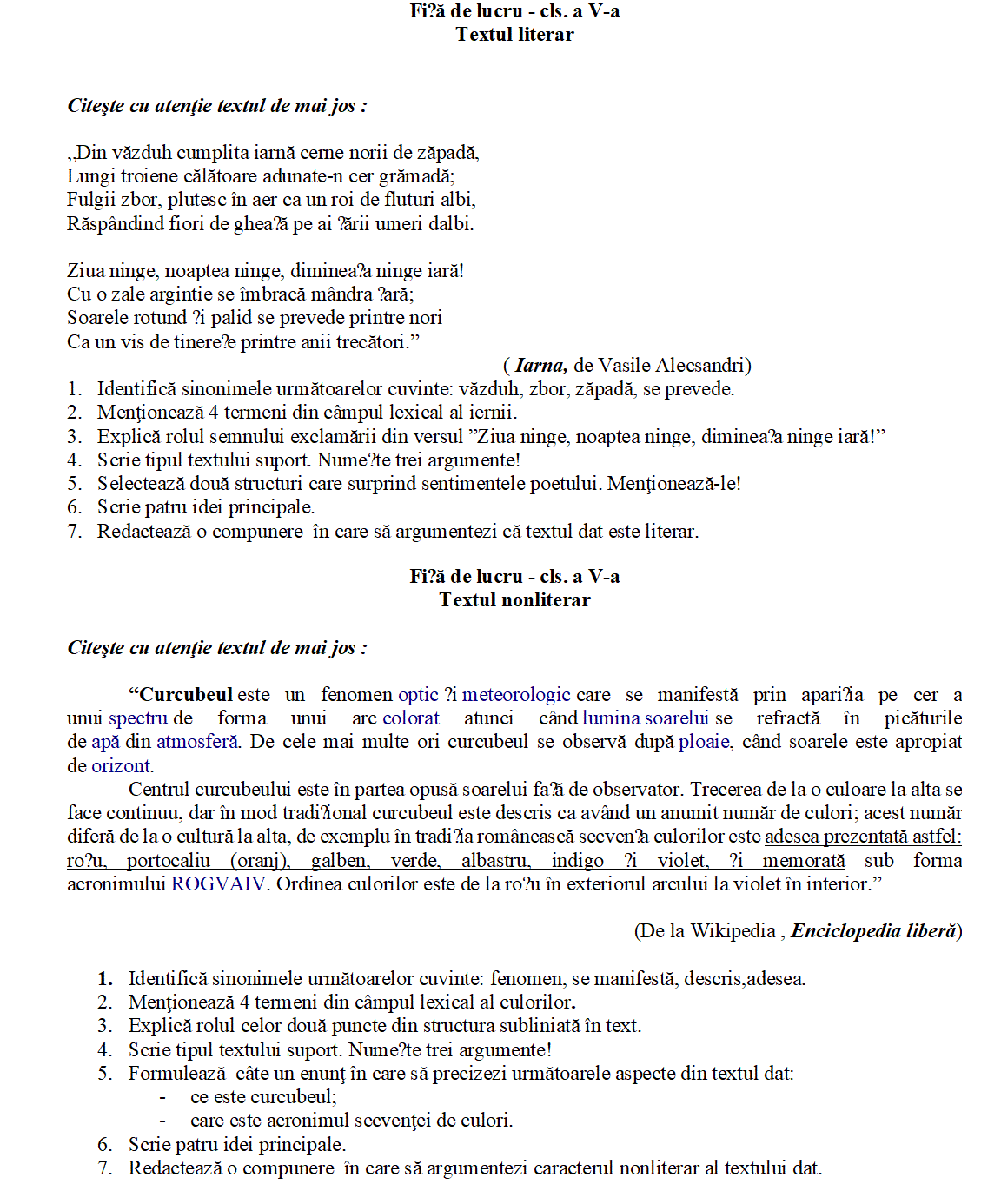 Prezenta fișă de lucru îmbină exerciții utile pentru textul literar și nonliterar.