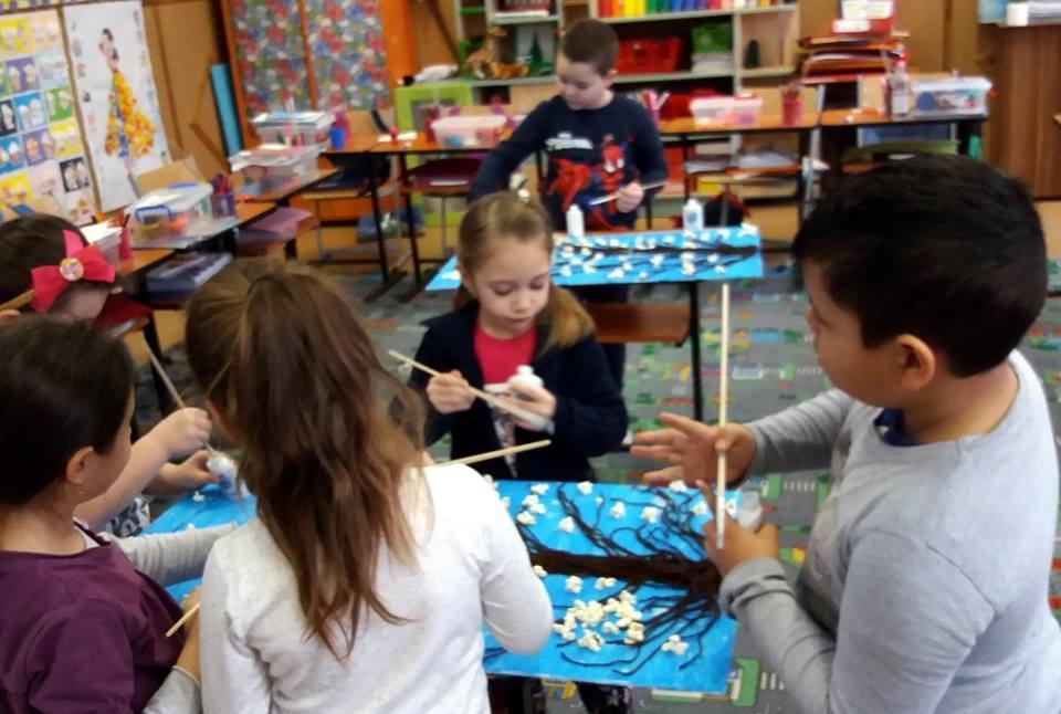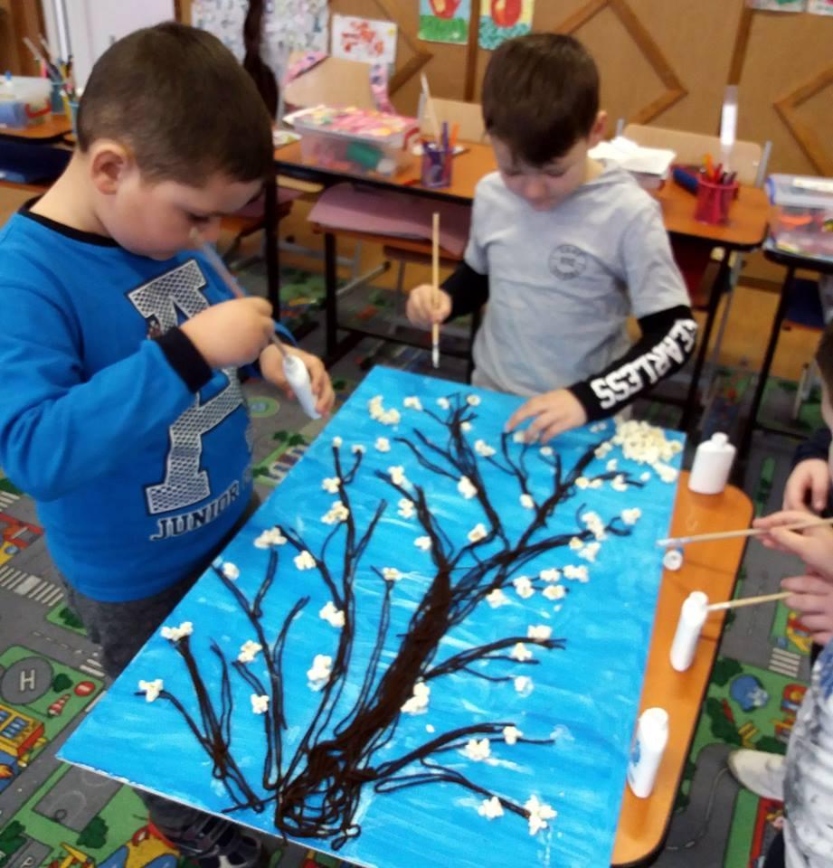 Activitate practic-aplicativă care cuprinde exerciții variate, cu caracter interdisciplinar, prezentate într-un stil atractiv, care vizează, pe lângă consolidarea deprinderilor de colorat și lipit fire ( ramurile copacului) și popcorn (florile) și stimularea și dezvoltarea imaginației și a creativității, precum și formarea deprinderilor de muncă în echipă. În timpul realizării tablourilor, se cântă cu elevii cântecelul „Copăcelul din grădină”.