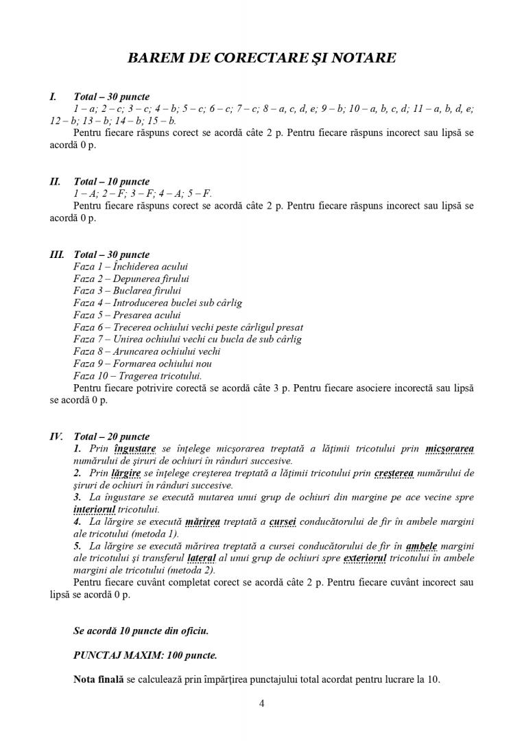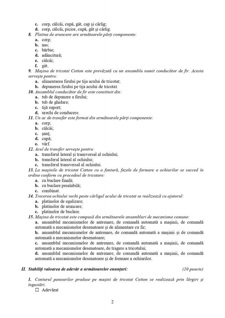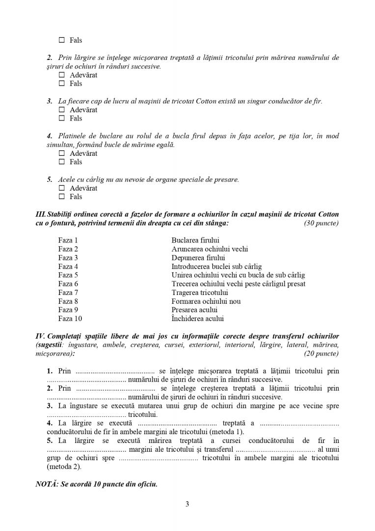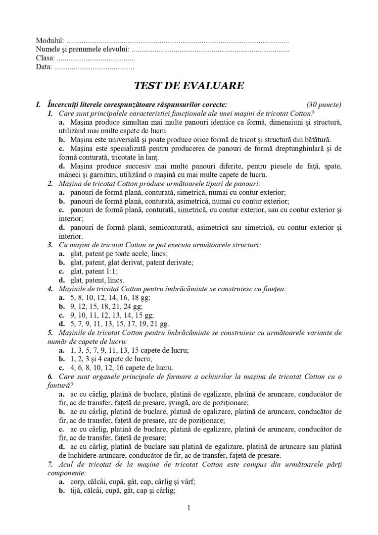 Test de evaluare din tema MAŞINI DE TRICOTAT COTTON. Conţine şi baremul de corectare şi notare.